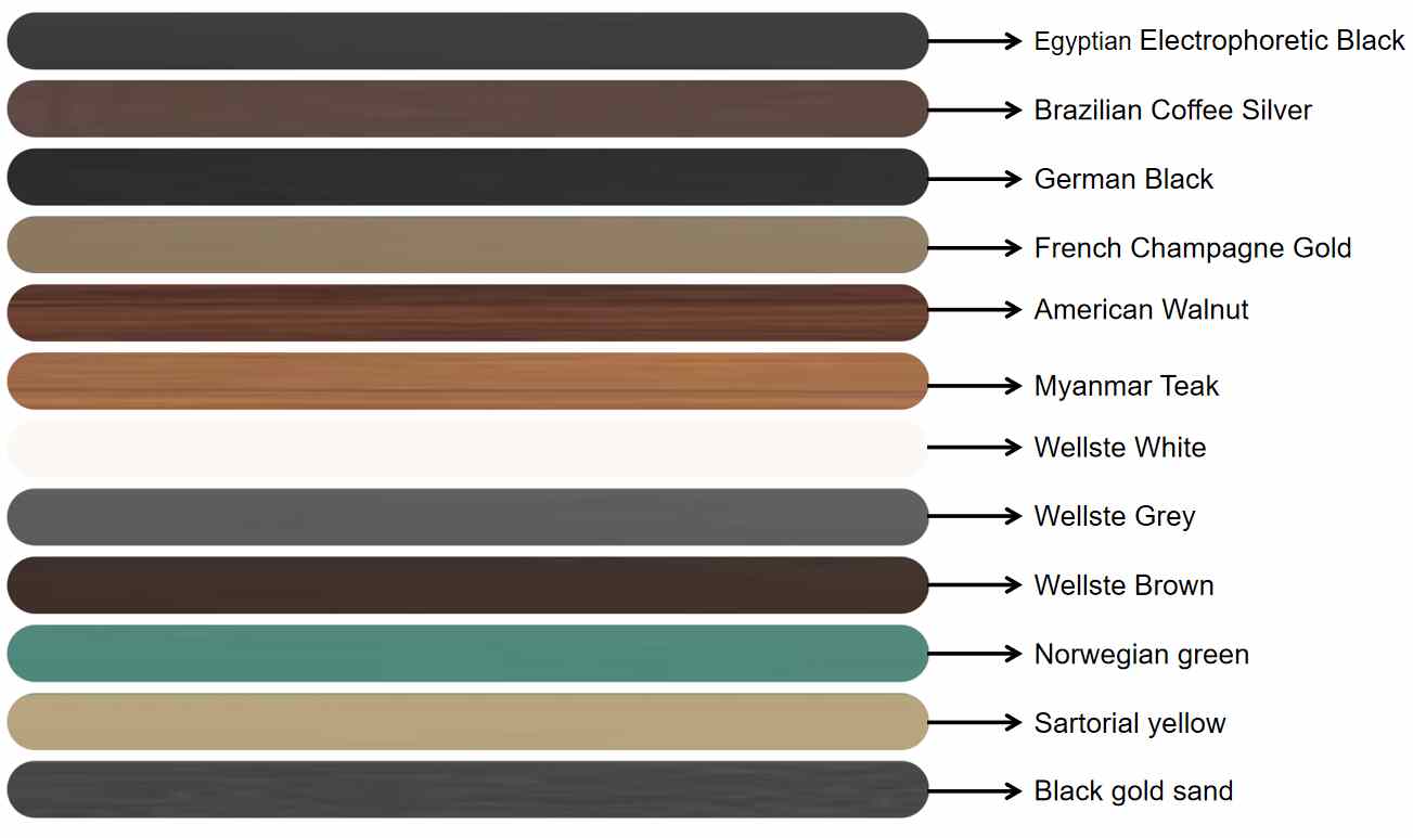 Wellste поддерживает выбор цветов для любого стиля. Вы можете выбрать из широкого спектра элегантных и долговечных цветов, чтобы удовлетворить ваши уникальные требования и дополнить любой архитектурный дизайн.